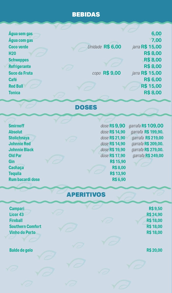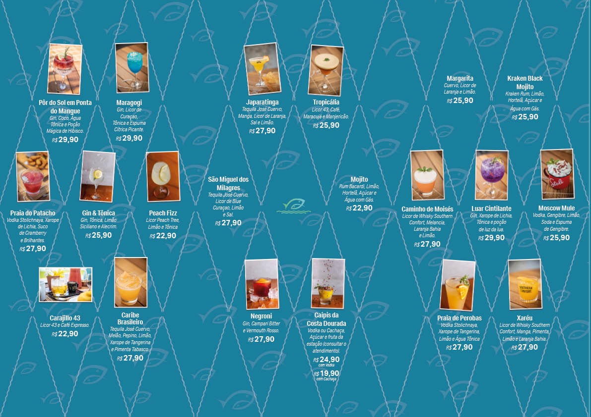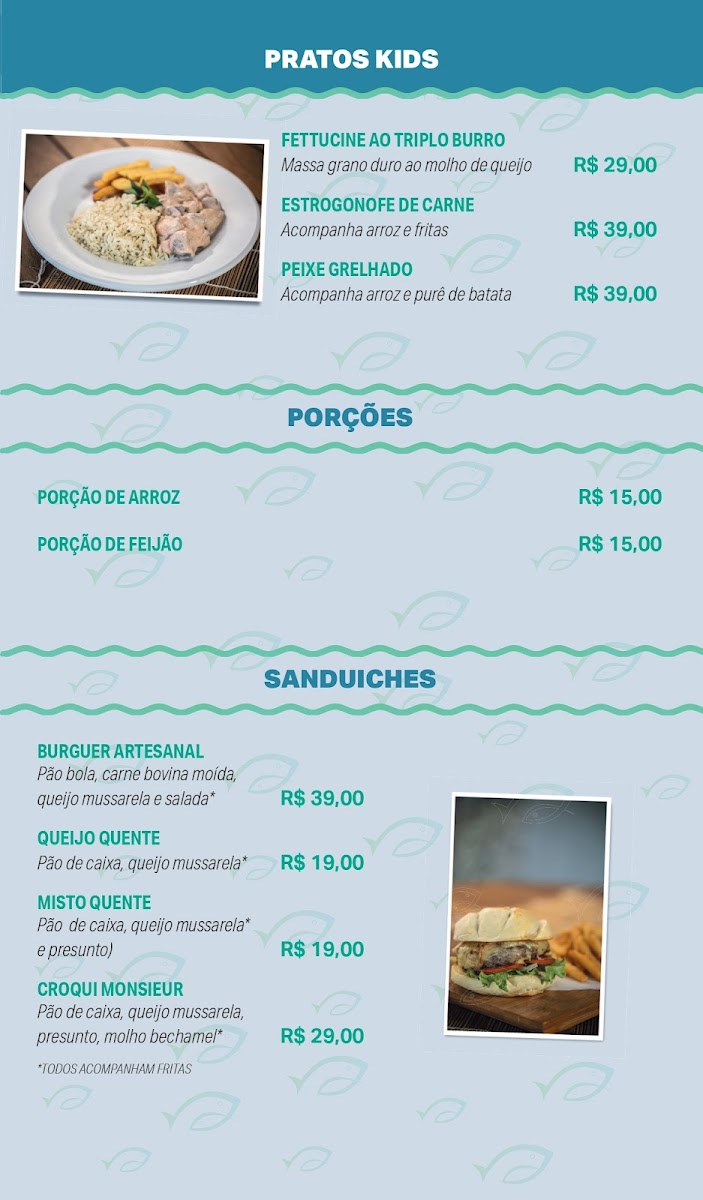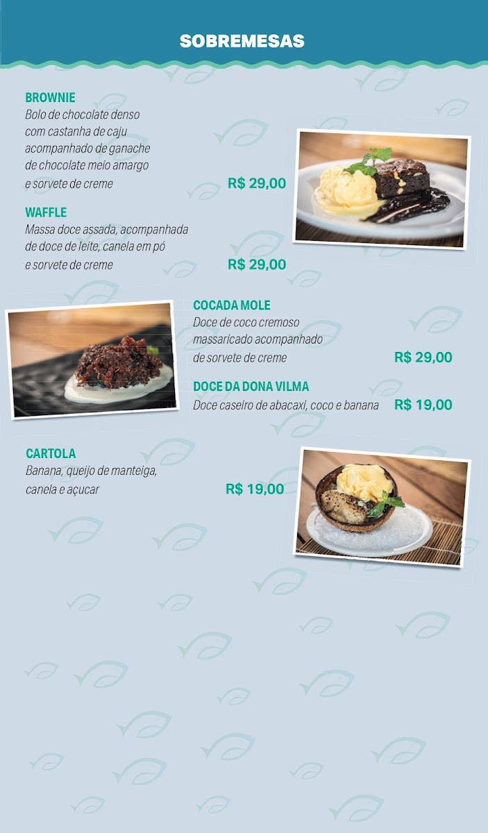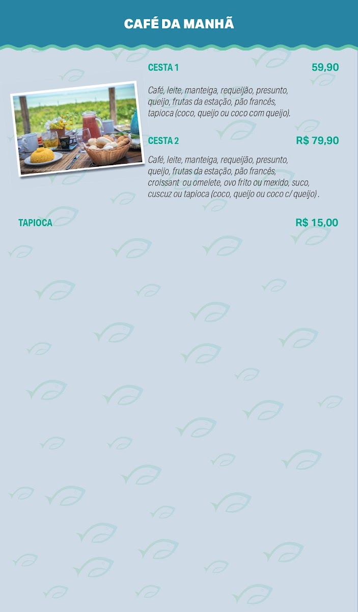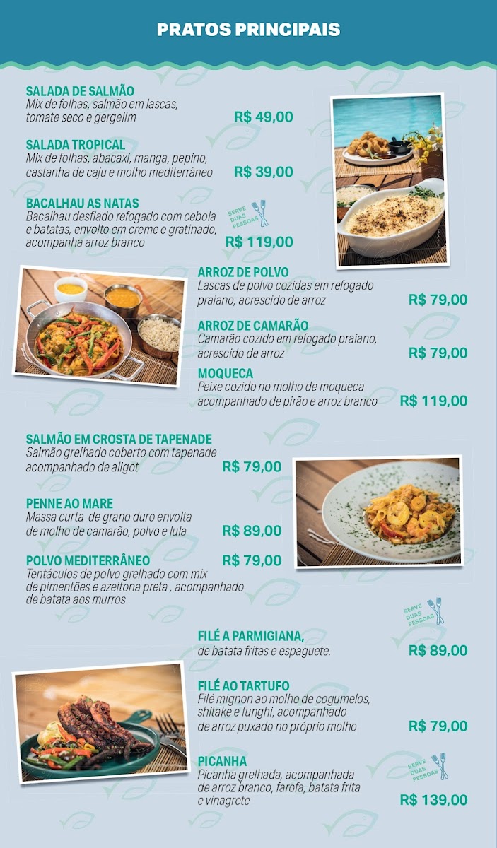 The menu offers a diverse selection of dishes suitable for various mealtimes, including breakfast, appetizers, main courses, and options for children. It features local seafood specialties, traditional Brazilian dishes, and a range of light and hearty options.